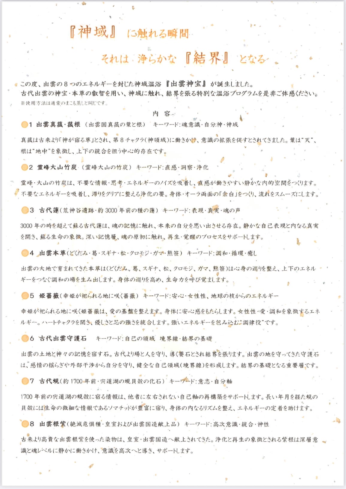 古代出雲の神宝・本草の叡智を用い、神域に触れ、結界を張る特別な温浴プログラム